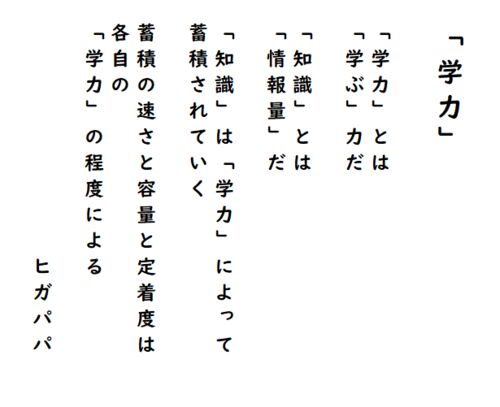 #ヒガパパ_ の「子どもの教育」に関する「ポエム」 (休日限定) №.203 (テキスト版) 「学力」 「学力」とは「学ぶ」力だ 「知識」とは「情報量」だ 「知識」は「学力」によって蓄積されていく 蓄積の速さと容量と定着度は各自の「学力」の程度による ヒガ…