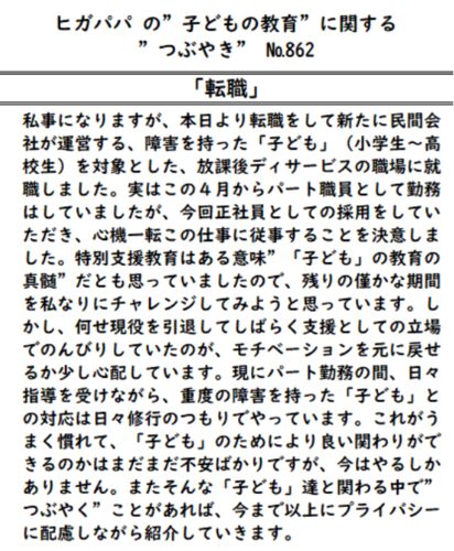 "ヒガパパ の”子どもの教育”に関する ”つぶやき” №862" (テキスト版) 「転職」 私事になりますが、本日より転職をして新たに民間会社が運営する、障害を持った「子ども」(小学生~高校生)を対象とした、放課後ディサービスの職場に就職しました。実はこ…