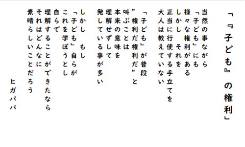 #ヒガパパ_ の「子どもの教育」に関する「ポエム」 (休日限定) №.230 (テキスト版) 「『子ども』の権利」 当然の事ながら「子ども」にも様々な権利があるしかし それを正当に行使する手立てを大人は教えていない 「子ども」が普段”権利だ権利だ”と叫ぶこ…