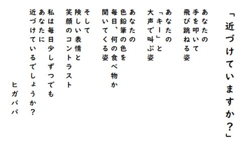 #ヒガパパ_ の「子どもの教育」に関する「ポエム」 (休日限定) №.235 (テキスト版) 「近づけていますか?」 あなたの手を叩いて飛び跳ねる姿 あなたの「キー」と大声で叫ぶ姿 あなたの色鉛筆の色を毎日、何の食べ物か聞いてくる姿 そして険しい表情と笑…