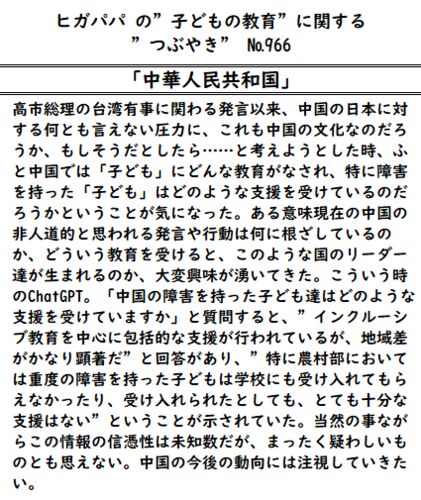 "ヒガパパ の”子どもの教育”に関する ”つぶやき” №966" (テキスト版) 「中華人民共和国」 高市総理の台湾有事に関わる発言以来、中国の日本に対する何とも言えない圧力に、これも中国の文化なのだろうか、もしそうだとしたら……と考えようとした時、ふと中…